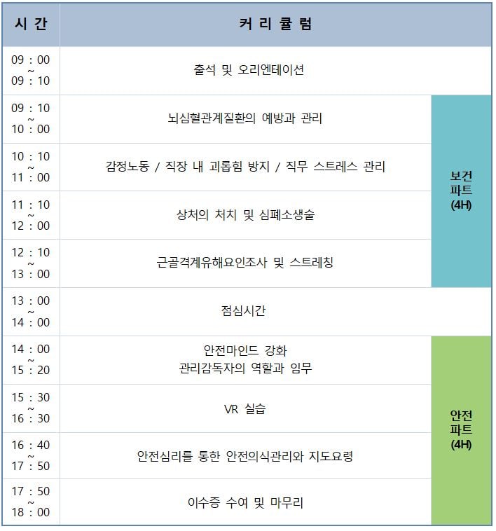 - 교육내용 : 산업안전보건법 31조, 시행규칙 제26조에 의거한 보건 및 안전 교육(하단의 커리큘럼 참조)