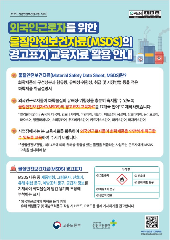 안전보건공단 안전보건자료실에 외국인근로자를 위한 물질안전보건자료(MSDS) 경고표지 교육자료 활용 안내가 게시되었습니다.